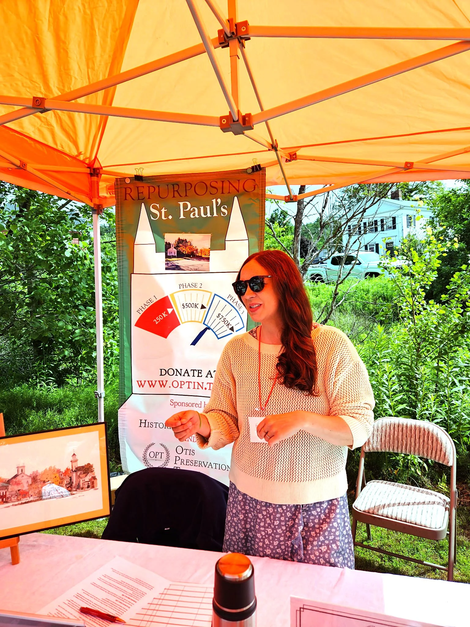 Katelyn Chaffee, member Library Building Committee, holding down the fort at the Otis Community Table. Photo: Stephanie Skinner